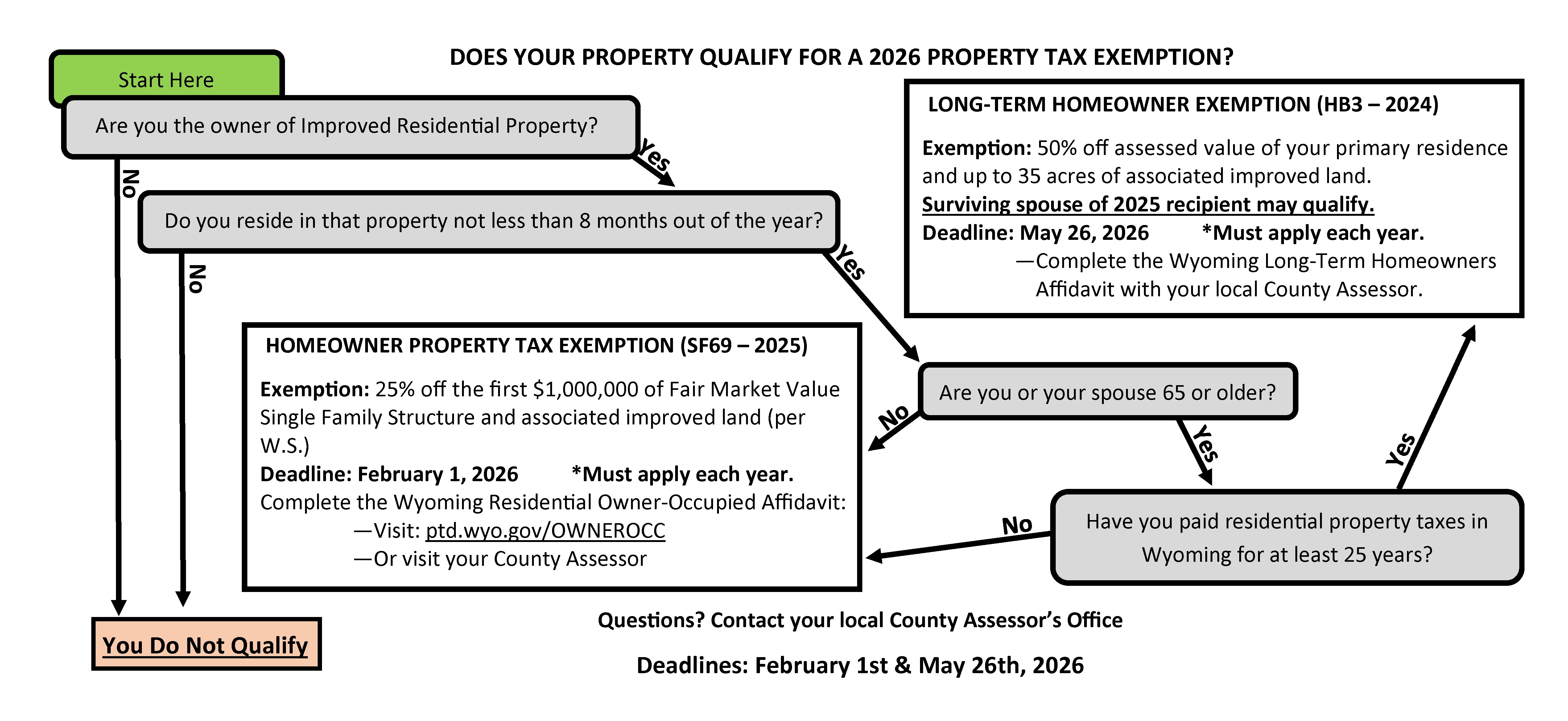 HOMEOWNER PROPERTY TAX EXEMPTION (SF69 – 2025) Exemption: 25% off the first $1,000,000 of Fair Market Value Deadline: February 1, 2026 *Must apply each year. Requirements: • Single-family residential structure and associated improved land (per W.S.). • Owner must occupy the residence 8+ months/year. • Complete the Wyoming Residential Owner-Occupied Affidavit: